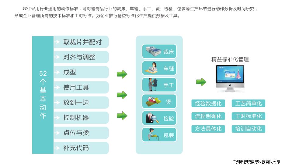 昊天制衣通过引进888官网集团GST标准化管理系统,实现工时标准化、优化生产工艺流程、实现管理精细化,为业务发展提供更加有力的支撑,发挥业务板块与实业板块之间的桥梁纽带作用。绿色生产,公司把传统产业优势和转型升级结合起来,对客户每一项新需求,新概念,新想法快速作出反应。通过GST标准,将全面管理公司的各种工艺技术标准,以及建立完善的标准工时核算和应用体系,进一步通过对技术人员(IE人员)、管理人员的GST分析培训,逐步深入标准化的应用,推进标准化,自动化,可视化,信息化改善,充分发挥信息技术在生产过程中的作用。